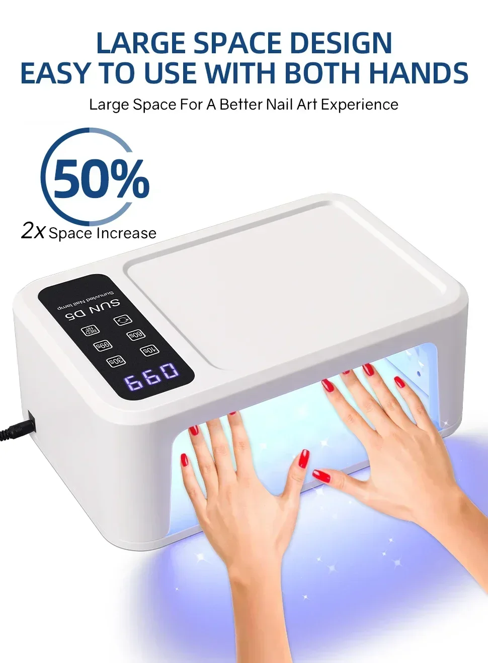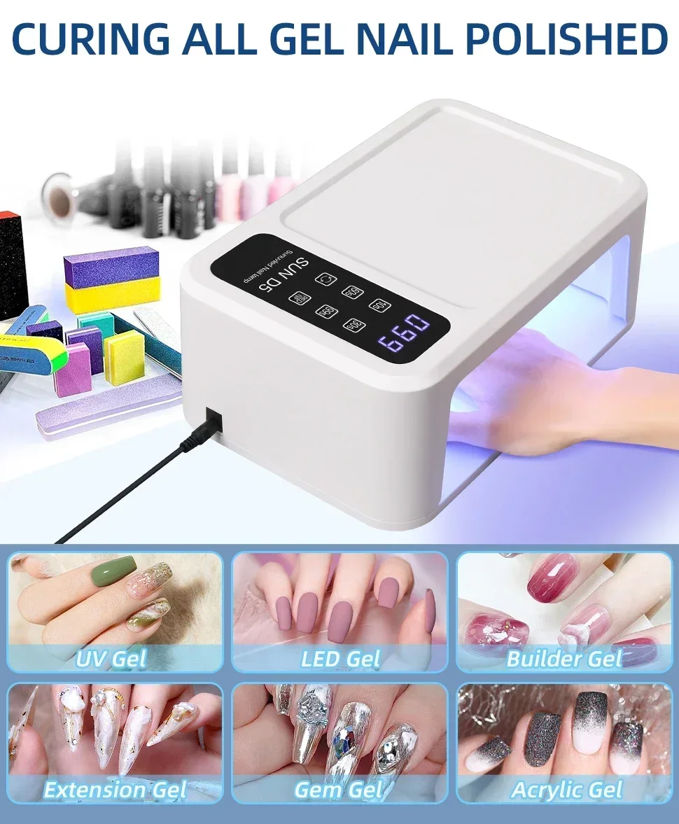 480W High Power Nail Lamp Fast Curing SUN D5 is a wired UV Led nail lamp and the premium quality nail lamp, it combines uv and led light, equipped with 480W high power can solidify your gel nail polish faster than other nails lamp. it is perfect for using at home or nail salon.
